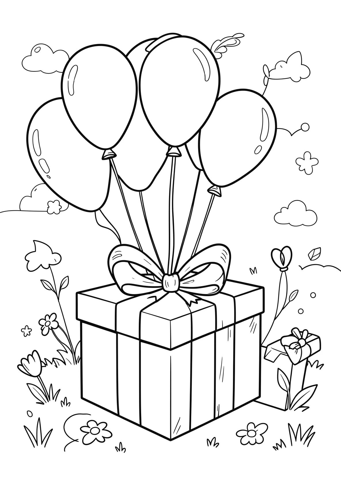 Geburtstagsgeschenk mit Schleife neben Luftballons - Ausmalbild