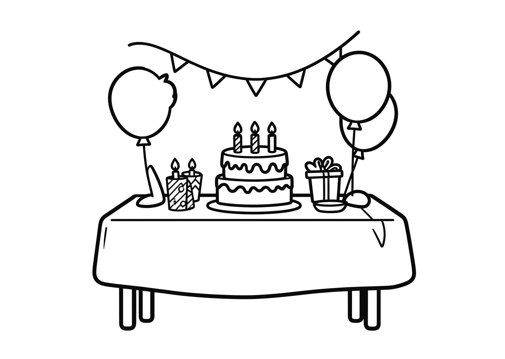 Kinderbuch erstellenGeburtstagsparty mit Tisch - Ausmalbild - kostenlos herunterladen