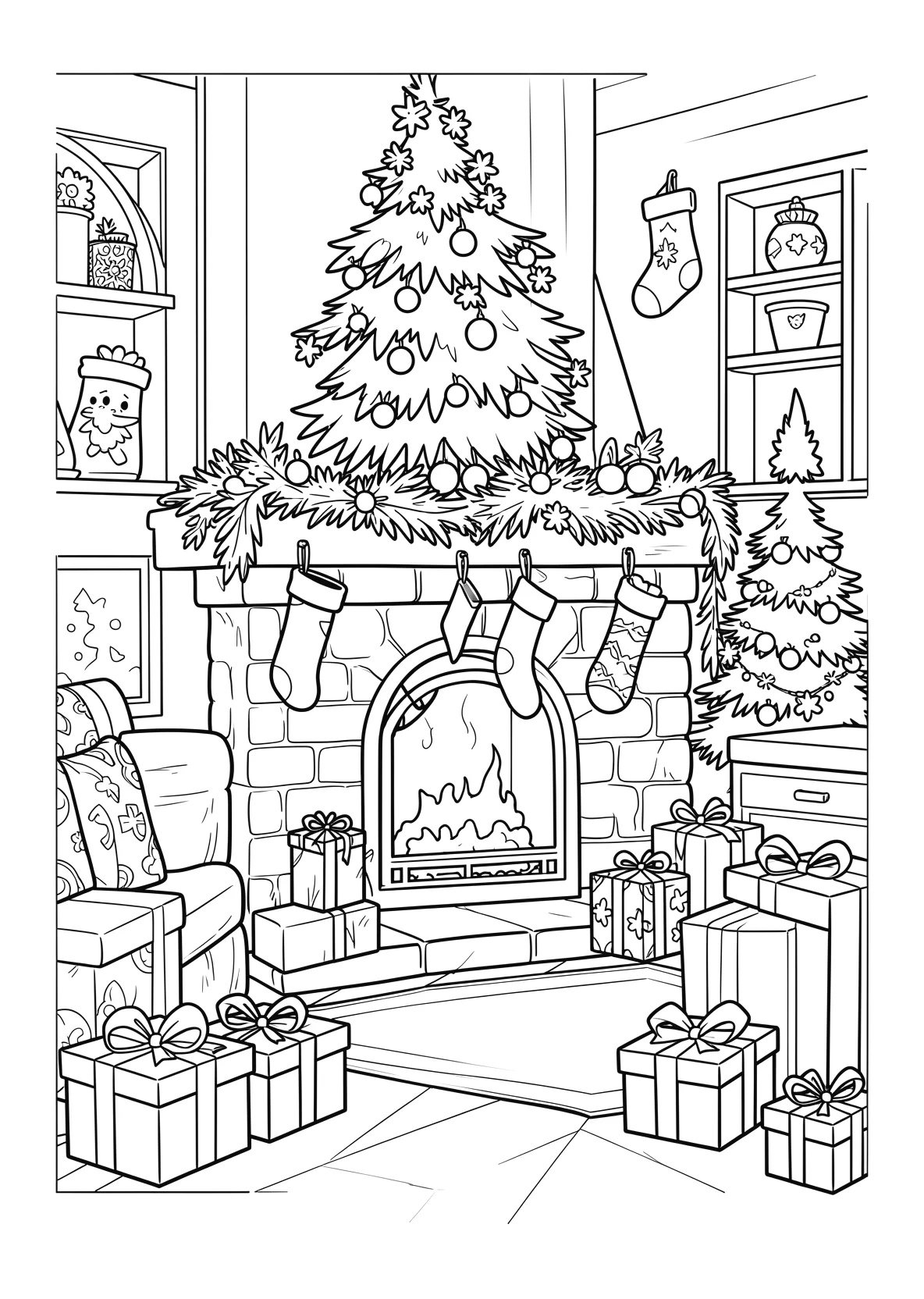 Gemütliche Weihnachtsstube mit Kamin - Ausmalbild
