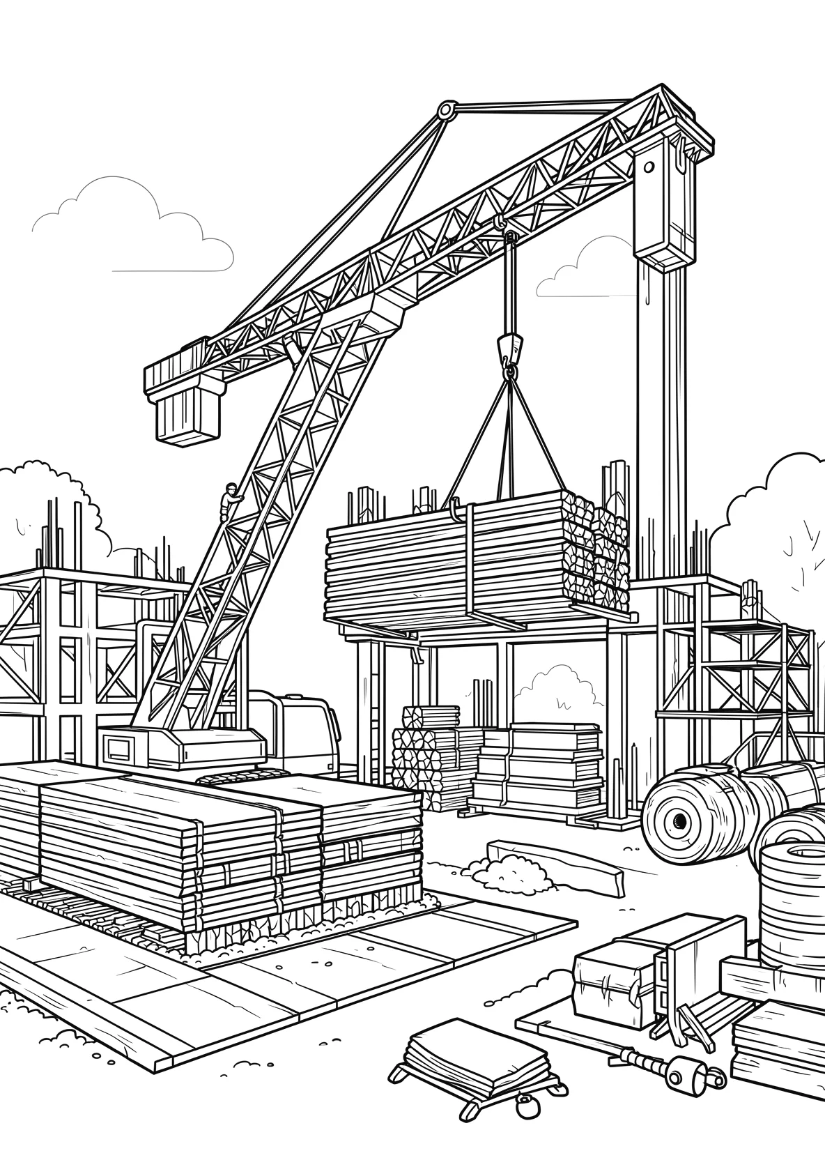 Großer Kran hebt Baumaterial auf einer Baustelle - Ausmalbild