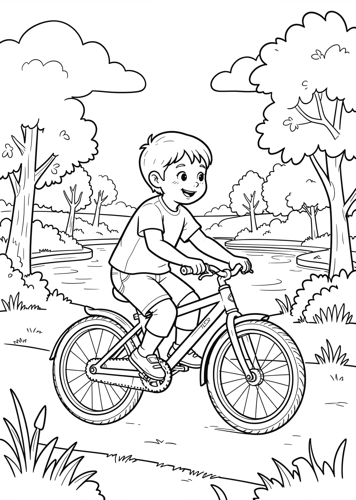Kinderbuch erstellenKind fährt Fahrrad an einem See mit Bäumen - Ausmalbild - kostenlos herunterladen