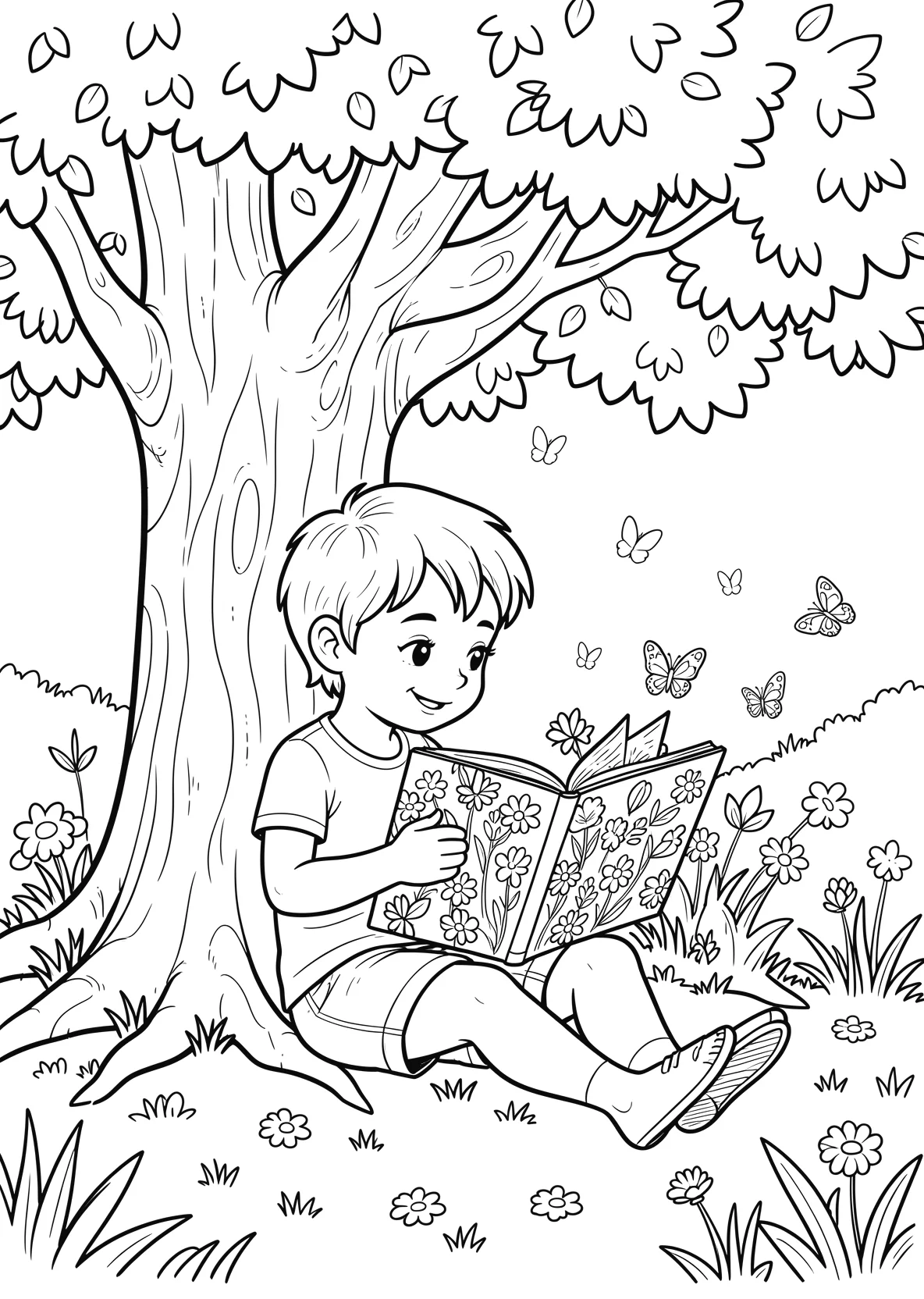 Kind sitzt unter einem großen Baum - Ausmalbild