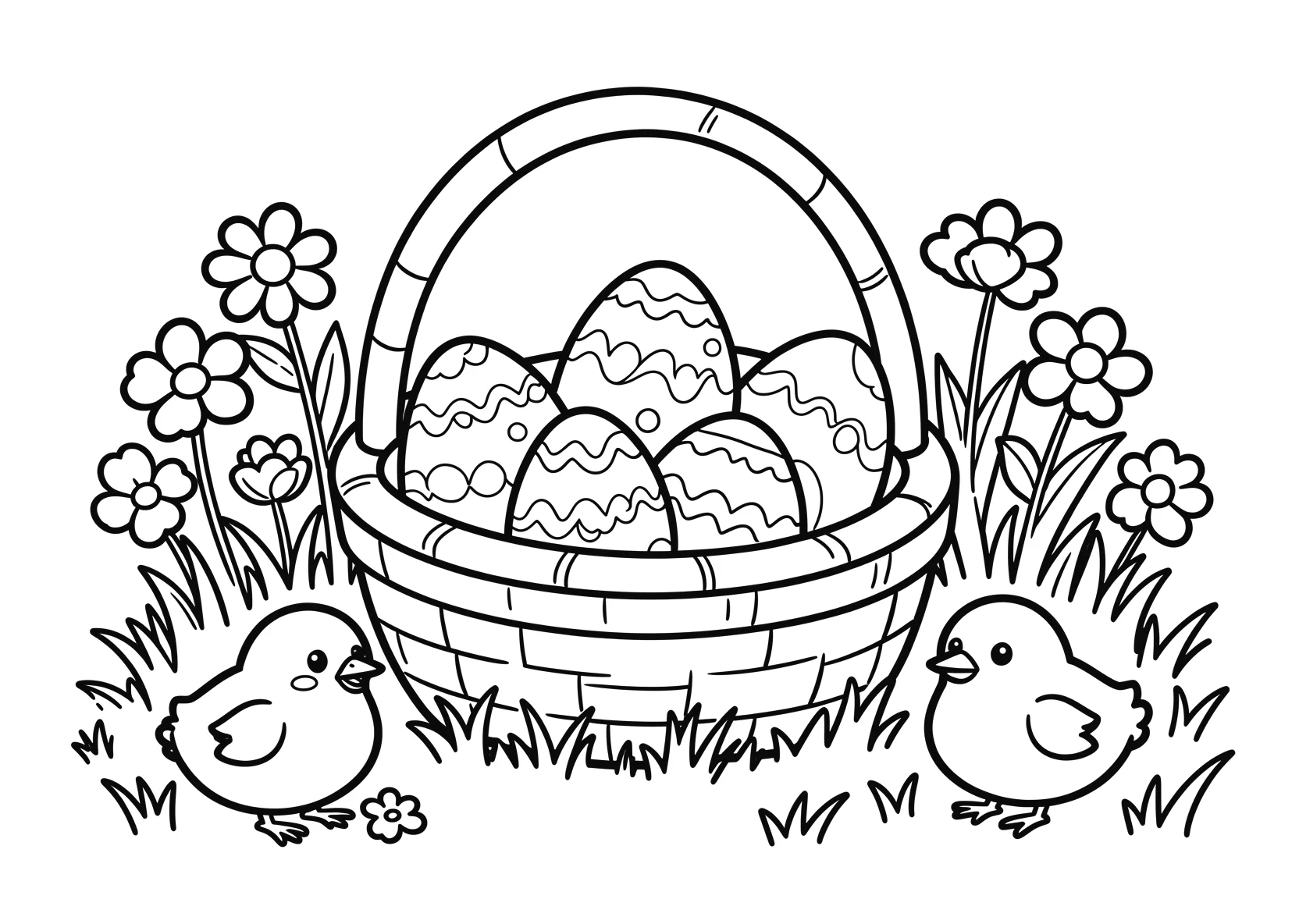 Korb voller Ostereier im Garten mit Blumen - Ausmalbild