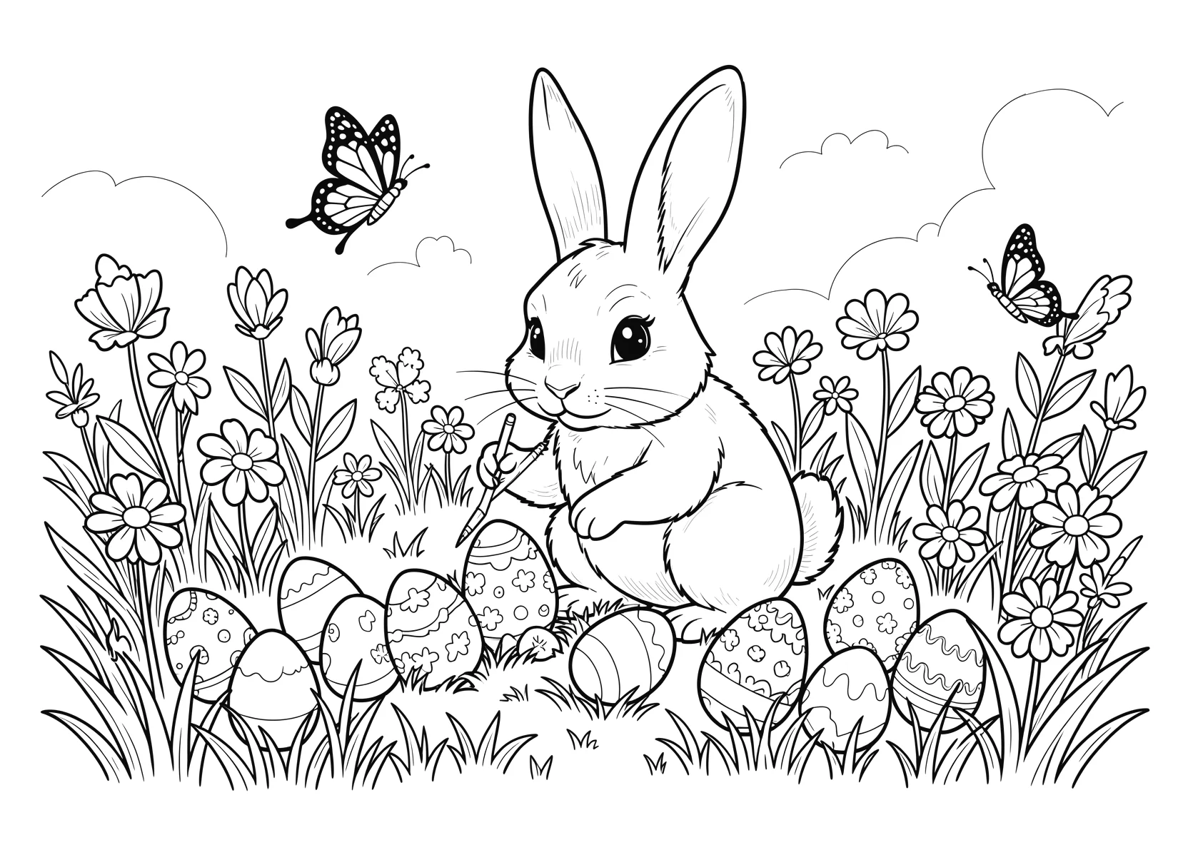 Osterhase bemalt Eier in einer Blumenwiese mit - Ausmalbild