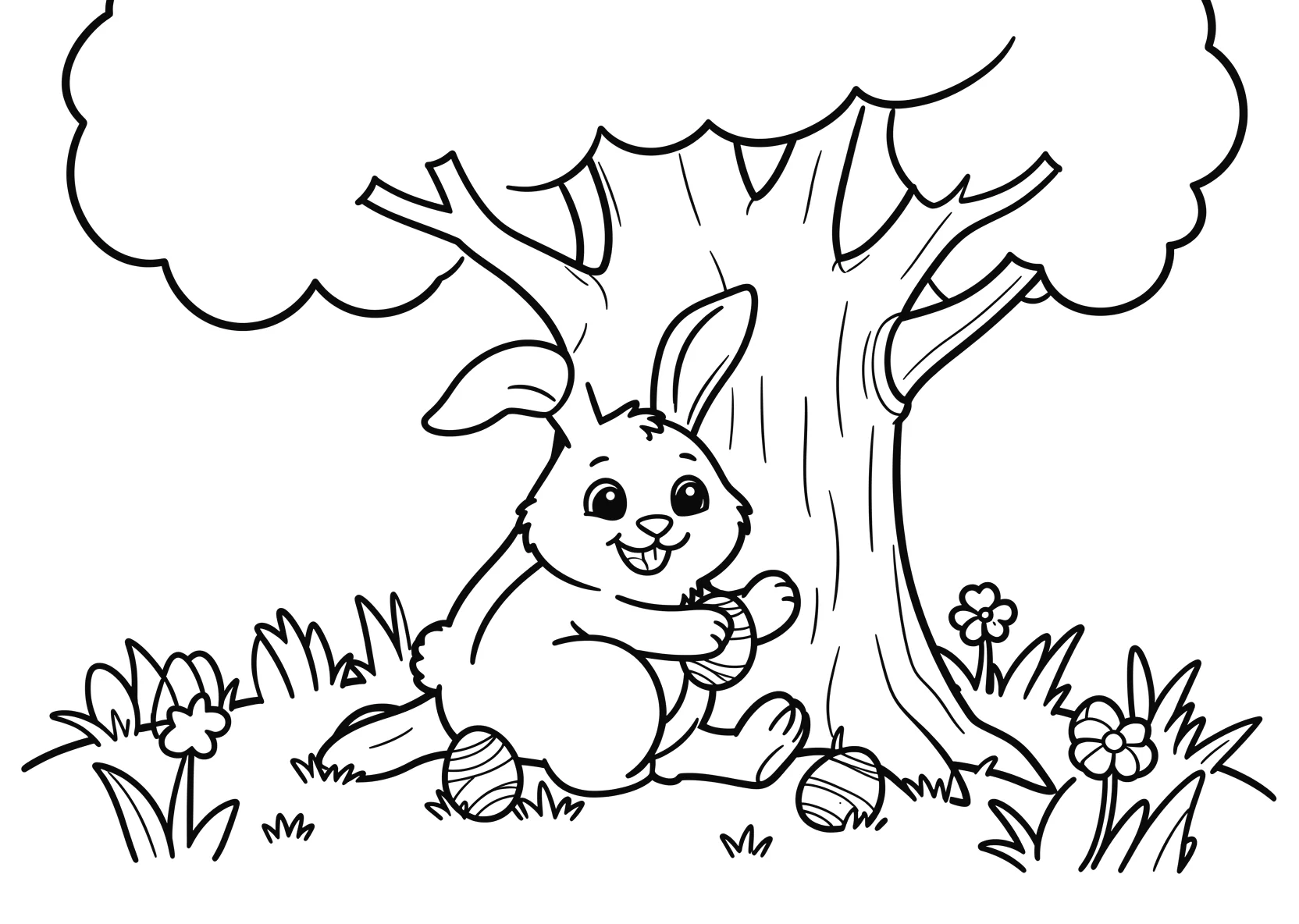 Osterhase versteckt Eier hinter einem Baum im - Ausmalbild