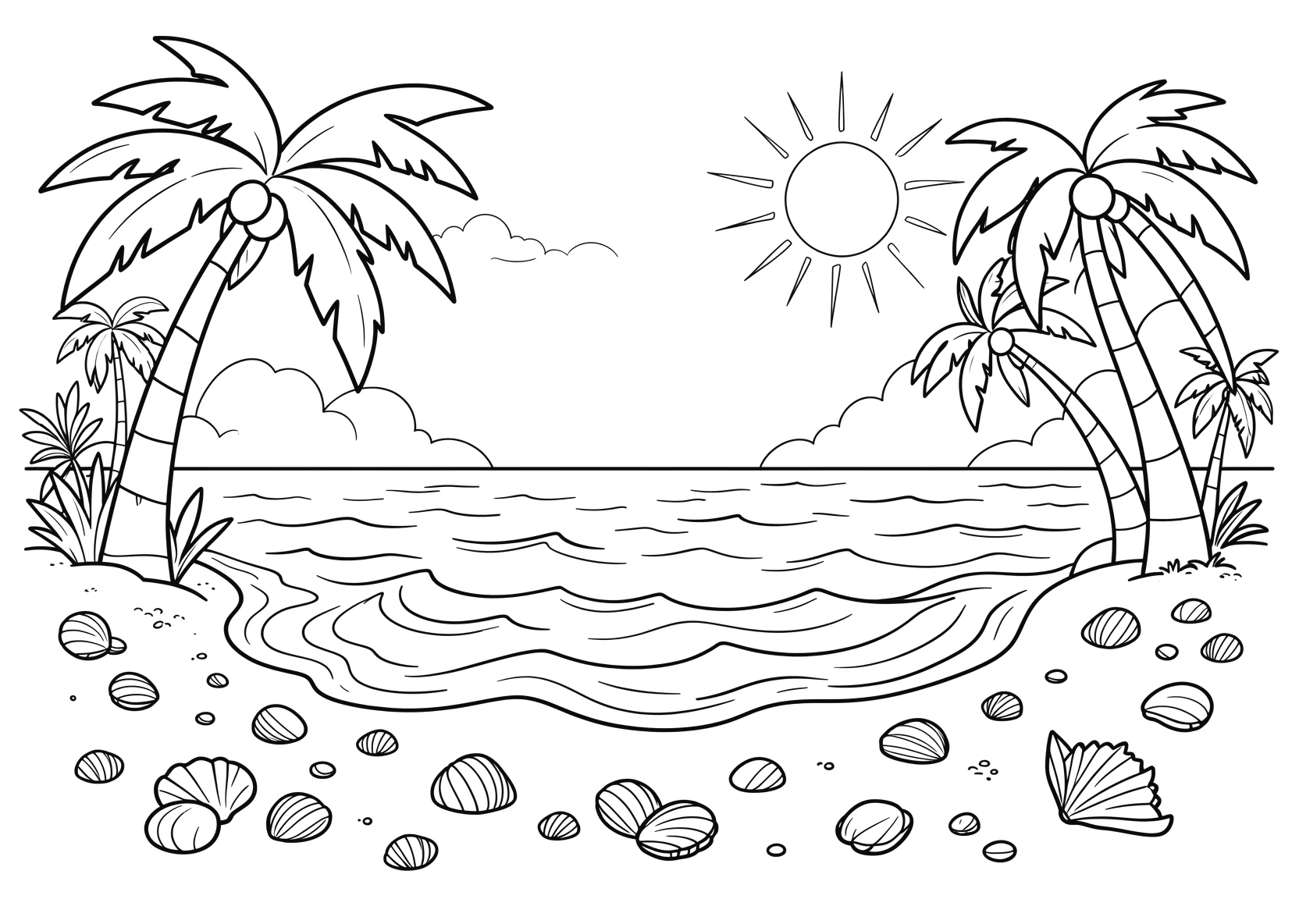 Strand mit Palmen, Muscheln, Wellen und Sonne - Ausmalbild