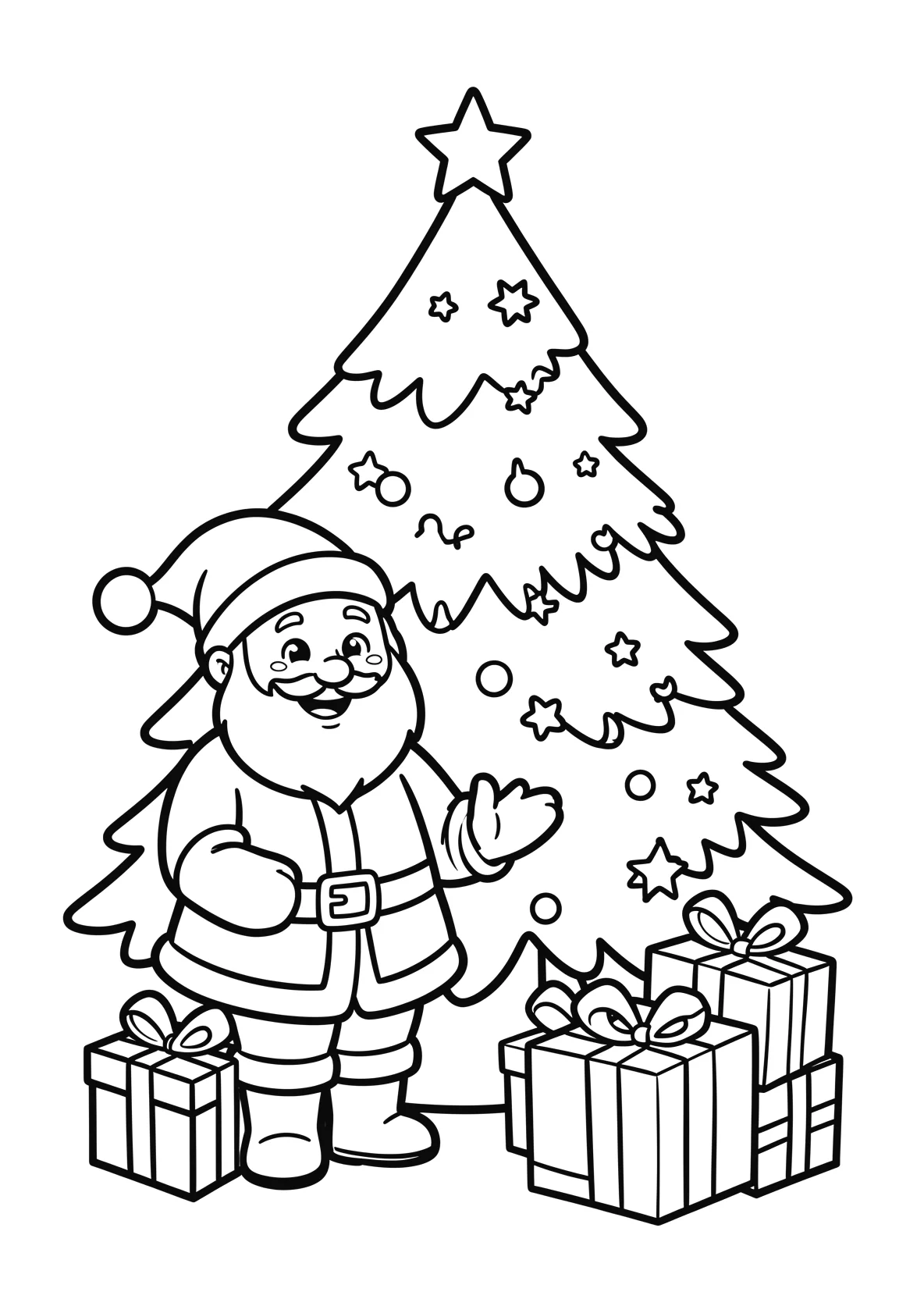 Weihnachtsmann mit Geschenken vor einem - Ausmalbild