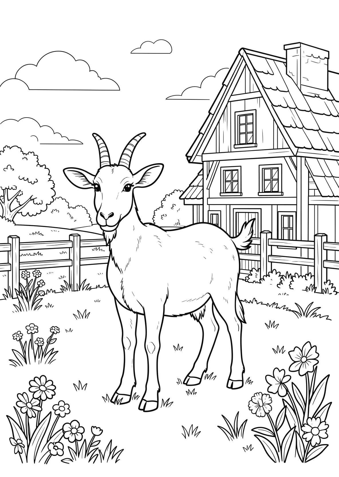 Ziege steht auf einer Wiese neben einem - Ausmalbild
