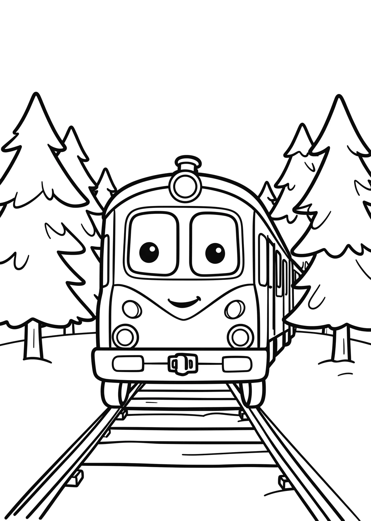 Zug fährt durch eine verschneite Winterlandschaft - Ausmalbild