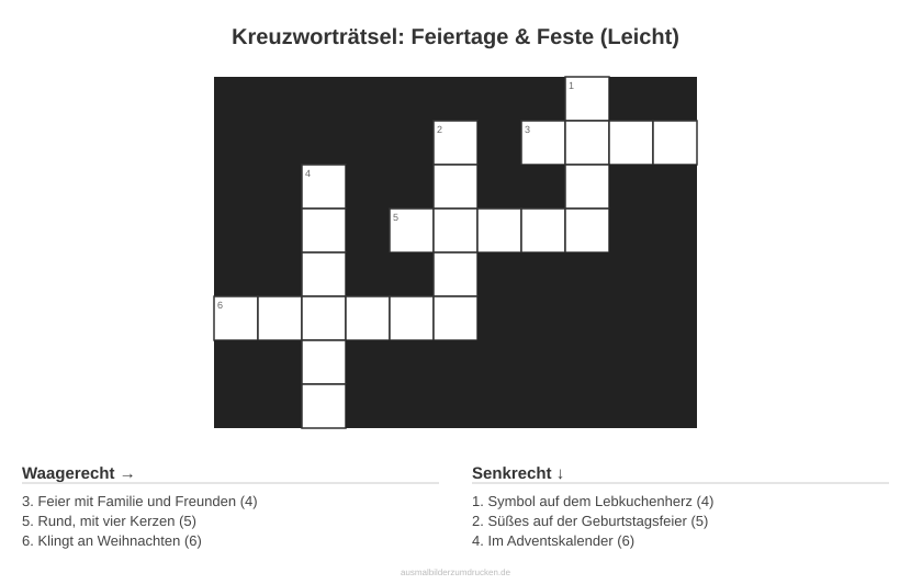 Köpfe rauchen lassen mit „Kreuzworträtsel: Feiertage & Feste (Leicht)“. Dieses Motiv aus dem Bereich Feste eignet sich besonders für Erwachsene und Jugendliche ab 15.