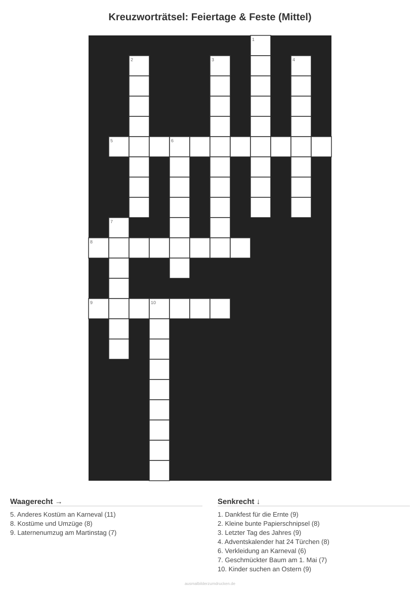„Kreuzworträtsel: Feiertage & Feste (Mittel)“ - ein Rätsel, das Wortschatz und Logik verbindet. Dieses Motiv aus dem Bereich Feste eignet sich besonders für 7- bis 10-Jährige.