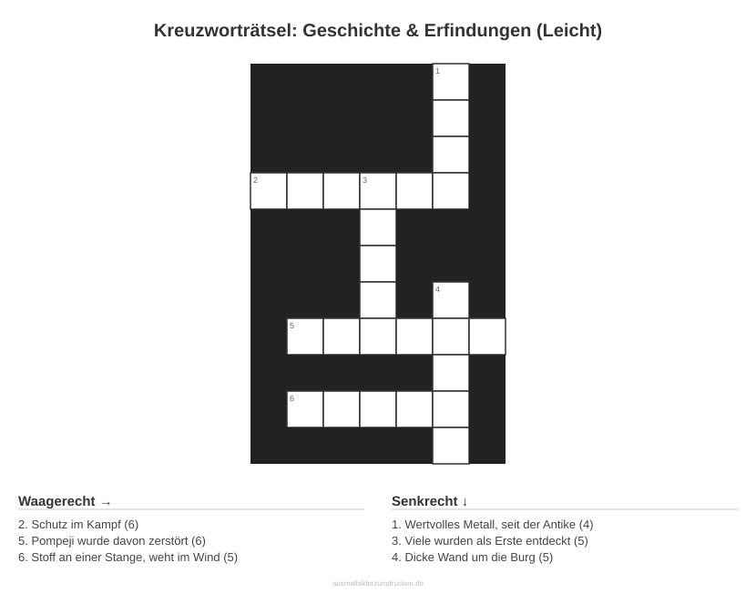 Wer Kreuzworträtsel mag, wird „Kreuzworträtsel: Geschichte & Erfindungen (Leicht)“ lieben. Dieses Motiv aus dem Bereich Geschichte eignet sich besonders für 5- bis 6-Jährige.