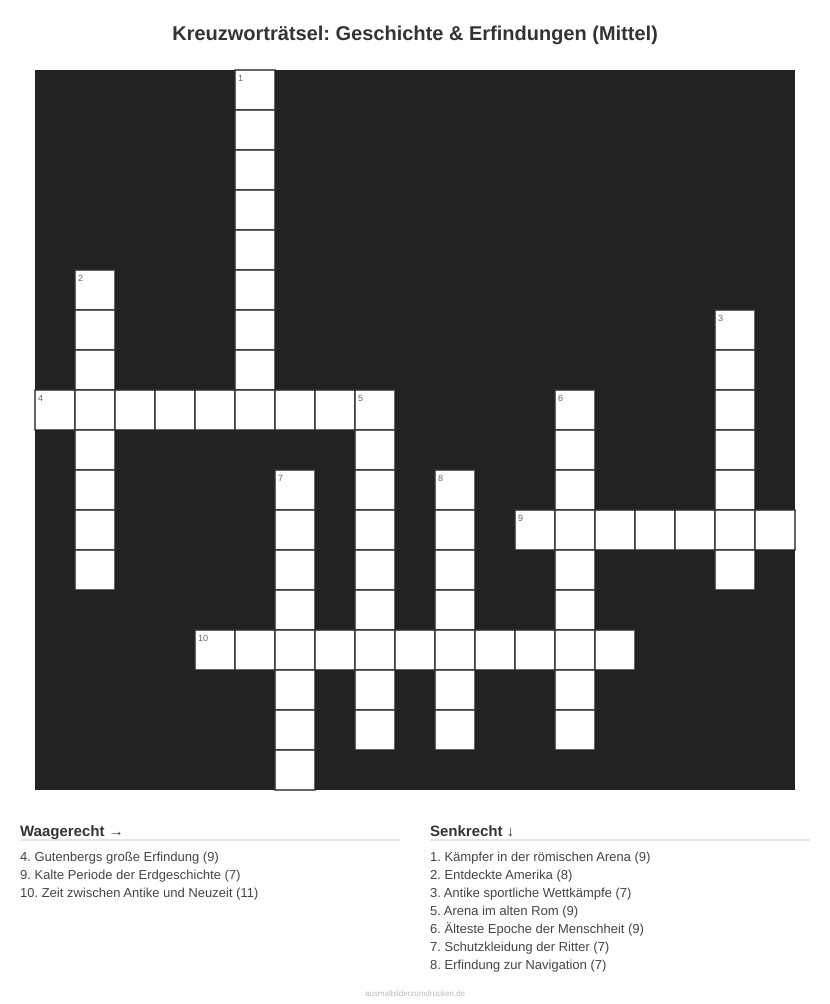 „Kreuzworträtsel: Geschichte & Erfindungen (Mittel)“ zum Ausdrucken und Losknobeln. Dieses Motiv aus dem Bereich Geschichte eignet sich besonders für 11- bis 14-Jährige.