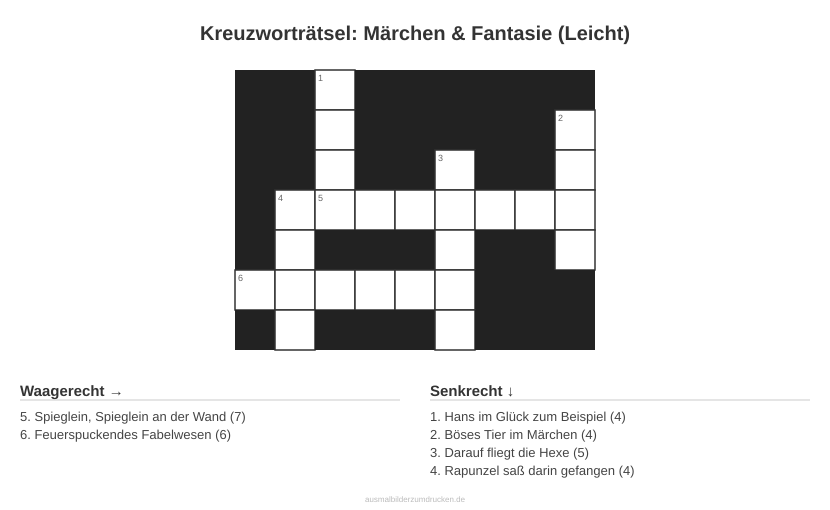„Kreuzworträtsel: Märchen & Fantasie (Leicht)“ - Rätselspaß mit Hinweisen und Buchstaben. Dieses Motiv aus dem Bereich Märchen eignet sich besonders für Erwachsene und Jugendliche ab 15.