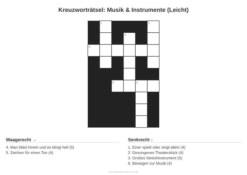 „Kreuzworträtsel: Musik & Instrumente (Leicht)“ - Rätselspaß mit Hinweisen und Buchstaben. Dieses Motiv aus dem Bereich Musik eignet sich besonders für die Kleinsten.