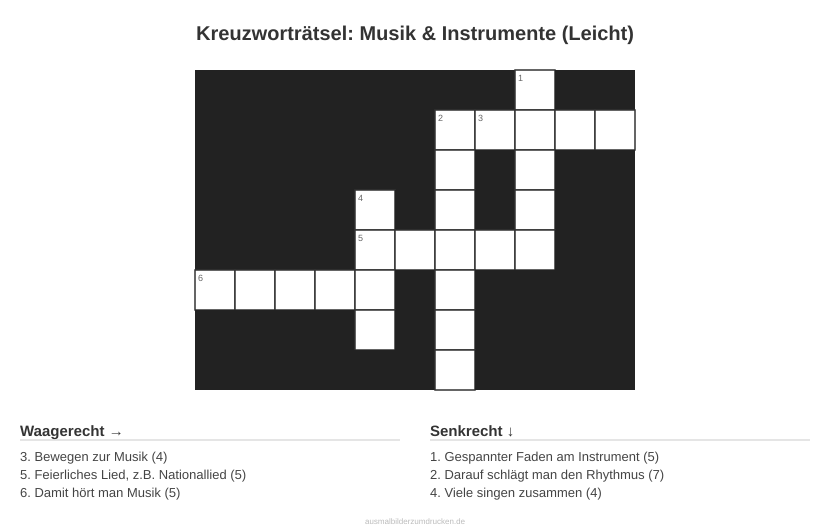 „Kreuzworträtsel: Musik & Instrumente (Leicht)“ - ein Klassiker unter den Worträtseln. Dieses Motiv aus dem Bereich Musik eignet sich besonders für 5- bis 6-Jährige.