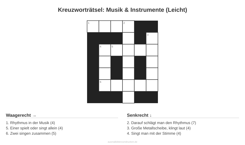 „Kreuzworträtsel: Musik & Instrumente (Leicht)“ - ein Klassiker unter den Worträtseln. Dieses Motiv aus dem Bereich Musik eignet sich besonders für 11- bis 14-Jährige.