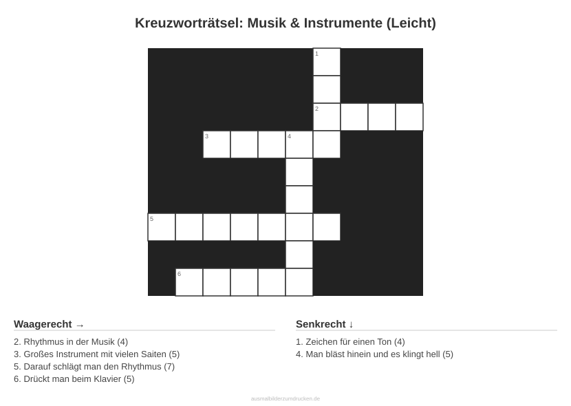 „Kreuzworträtsel: Musik & Instrumente (Leicht)“ - ein Klassiker unter den Worträtseln. Dieses Motiv aus dem Bereich Musik eignet sich besonders für 5- bis 6-Jährige.