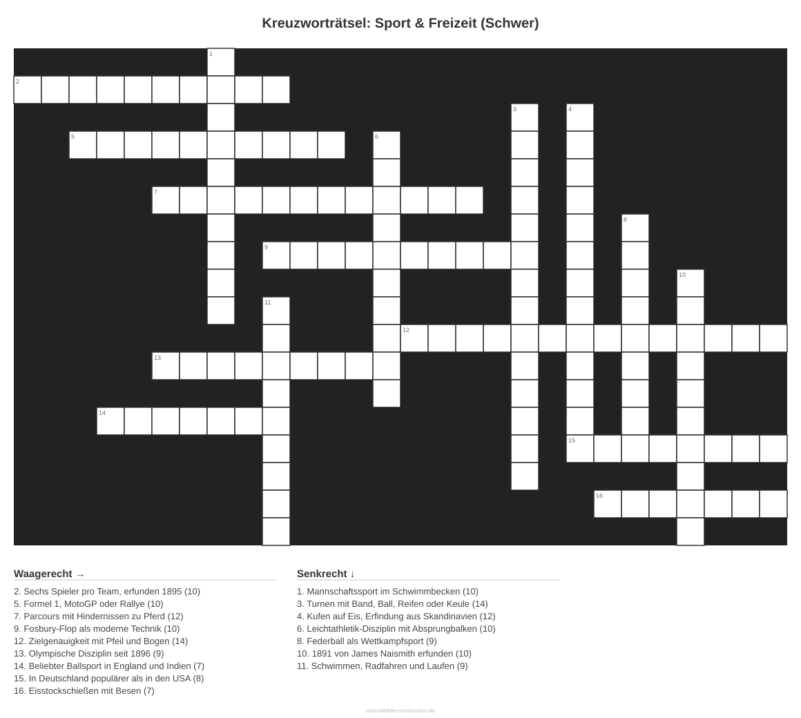 „Kreuzworträtsel: Sport & Freizeit (Schwer)“ - ein Kreuzworträtsel zum Ausdrucken. Dieses Motiv aus dem Bereich Sport eignet sich besonders für Erwachsene und Jugendliche ab 15.