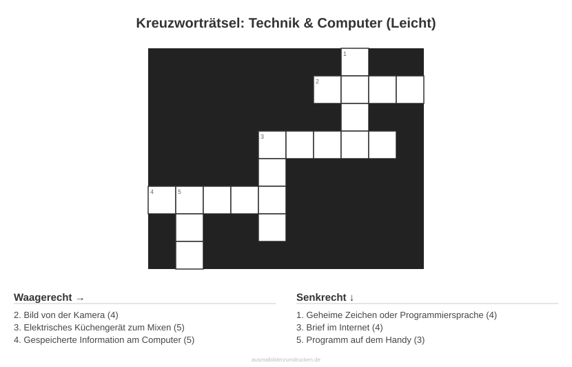 „Kreuzworträtsel: Technik & Computer (Leicht)“ - ein Rätsel, das Wortschatz und Logik verbindet. Dieses Motiv aus dem Bereich Technik eignet sich besonders für die Kleinsten.
