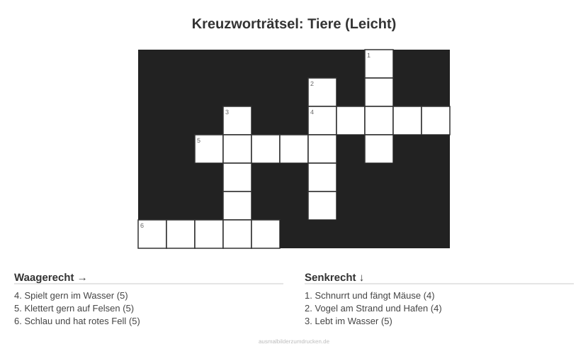 „Kreuzworträtsel: Tiere (Leicht)“ - Rätselspaß mit Hinweisen und Buchstaben. Dieses Motiv aus dem Bereich Tiere eignet sich besonders für die Kleinsten.