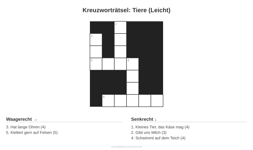 „Kreuzworträtsel: Tiere (Leicht)“ - ein Klassiker unter den Worträtseln. Dieses Motiv aus dem Bereich Tiere eignet sich besonders für 5- bis 6-Jährige.