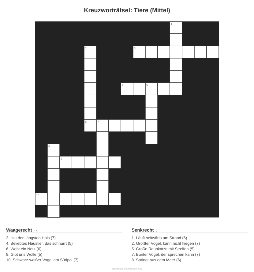 „Kreuzworträtsel: Tiere (Mittel)“ zum Ausdrucken und Losknobeln. Dieses Motiv aus dem Bereich Tiere eignet sich besonders für 7- bis 10-Jährige.