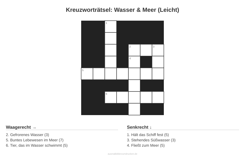 „Kreuzworträtsel: Wasser & Meer (Leicht)“ - ein Rätsel, das Wortschatz und Logik verbindet. Dieses Motiv aus dem Bereich Wasser eignet sich besonders für 5- bis 6-Jährige.
