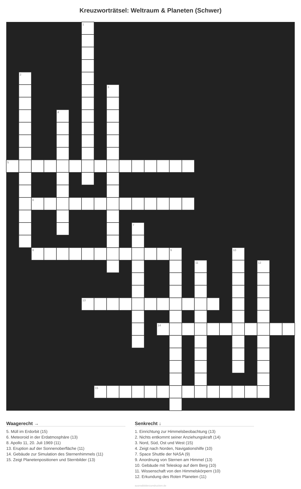 „Kreuzworträtsel: Weltraum & Planeten (Schwer)“ - ein Rätsel, das Wortschatz und Logik verbindet. Dieses Motiv aus dem Bereich Weltraum eignet sich besonders für Erwachsene und Jugendliche ab 15.