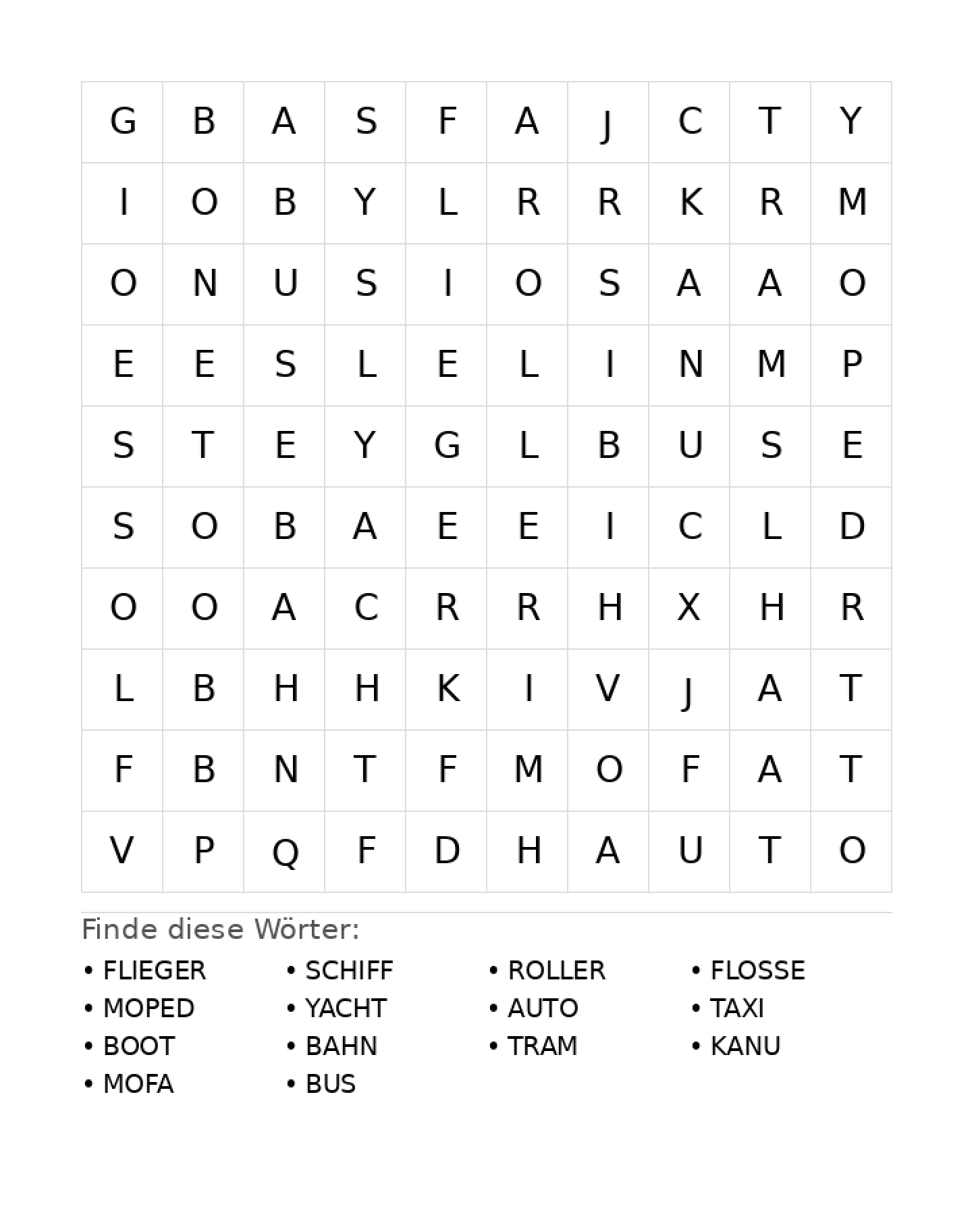 Wortsuchrätsel Wortsuchrätsel: Fahrzeuge für Grundschule aus der Kategorie Wortsuchrätsel - kostenlos ausdrucken