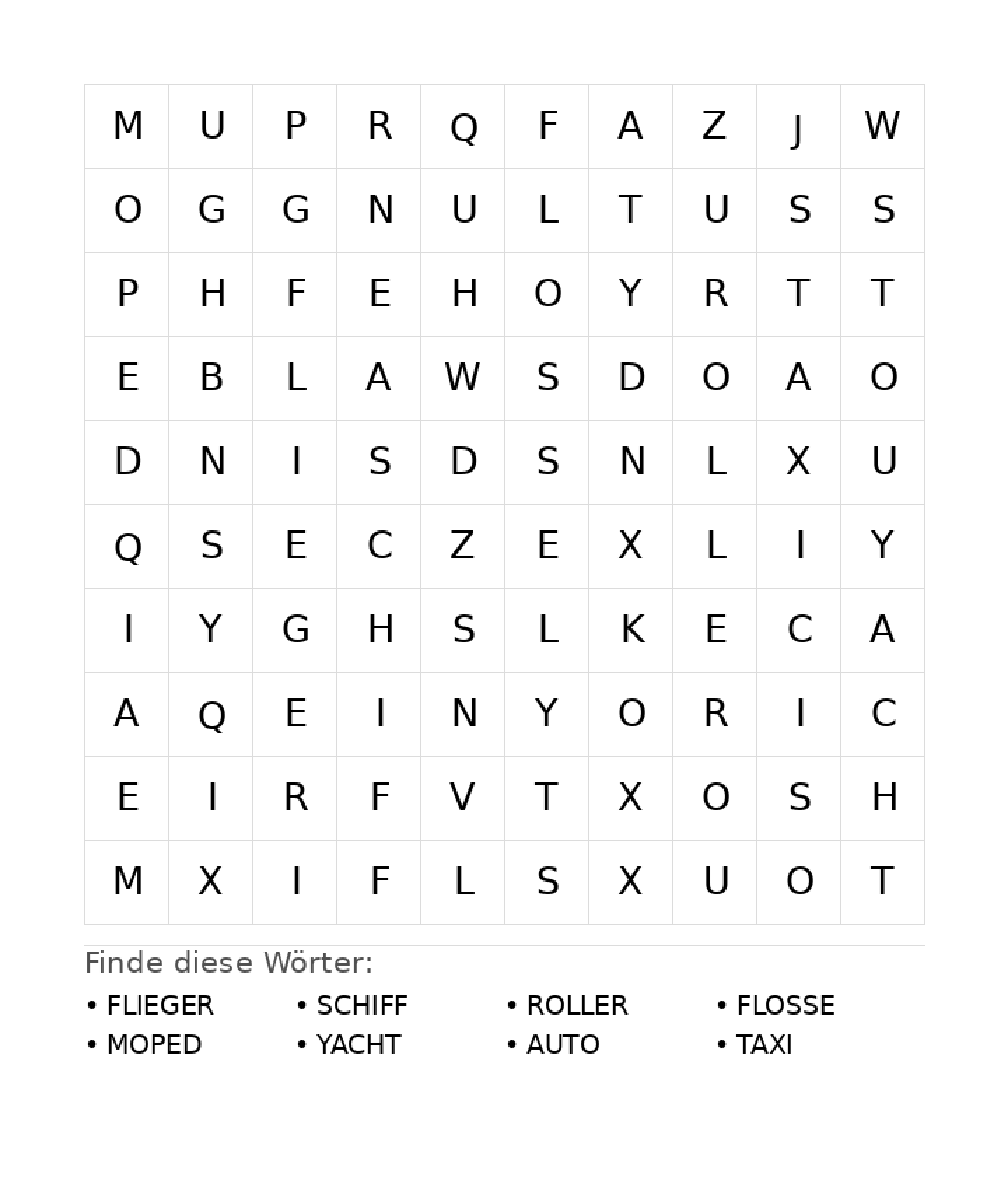 In „Wortsuchrätsel: Fahrzeuge für Grundschule“ verstecken sich jede Menge Begriffe. Findet ihr alle? Dieses Motiv aus dem Bereich Wortsuchrätsel eignet sich besonders für 7- bis 10-Jährige.