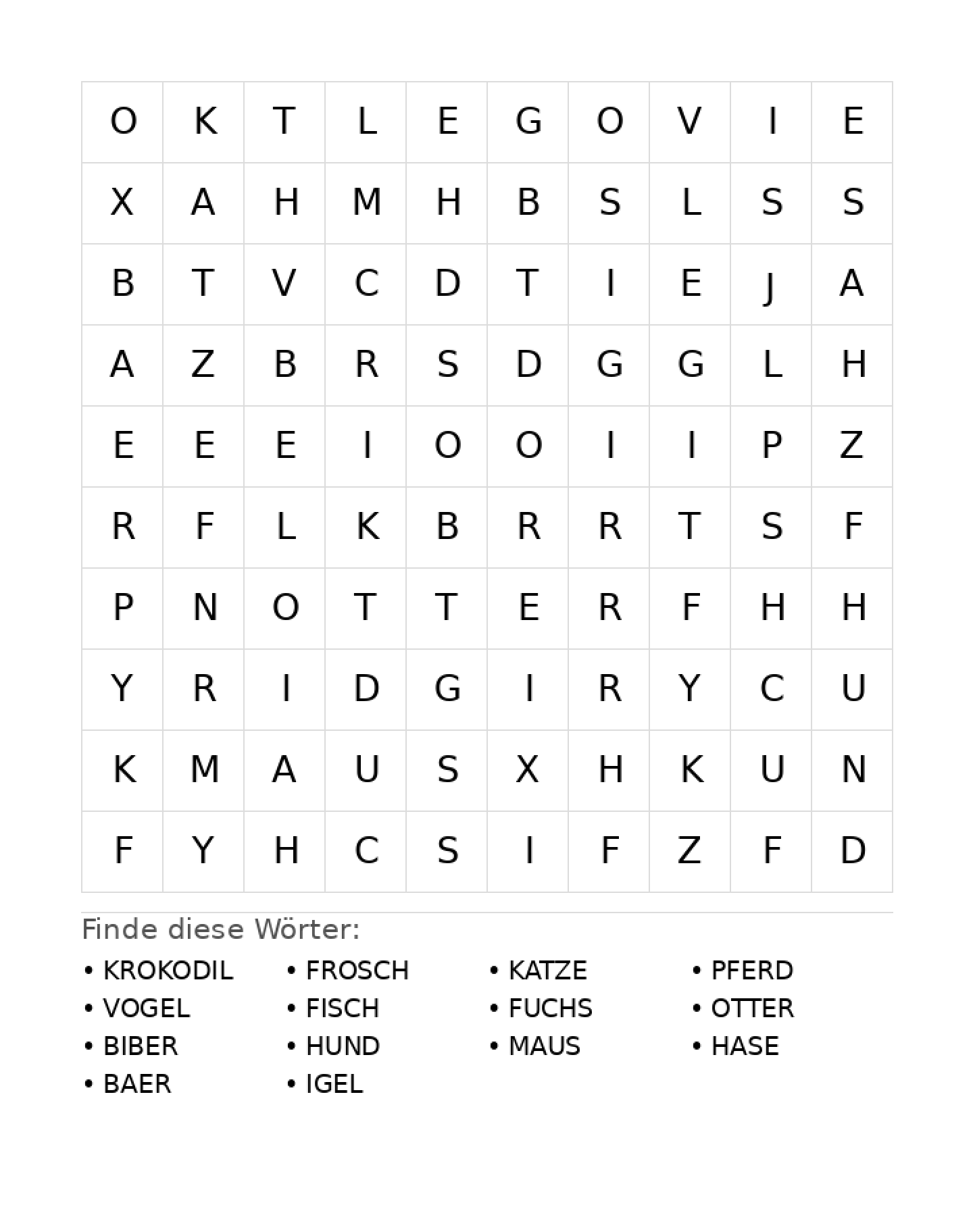 Wortsuchrätsel Wortsuchrätsel: Tiere für Grundschule aus der Kategorie Wortsuchrätsel - kostenlos ausdrucken