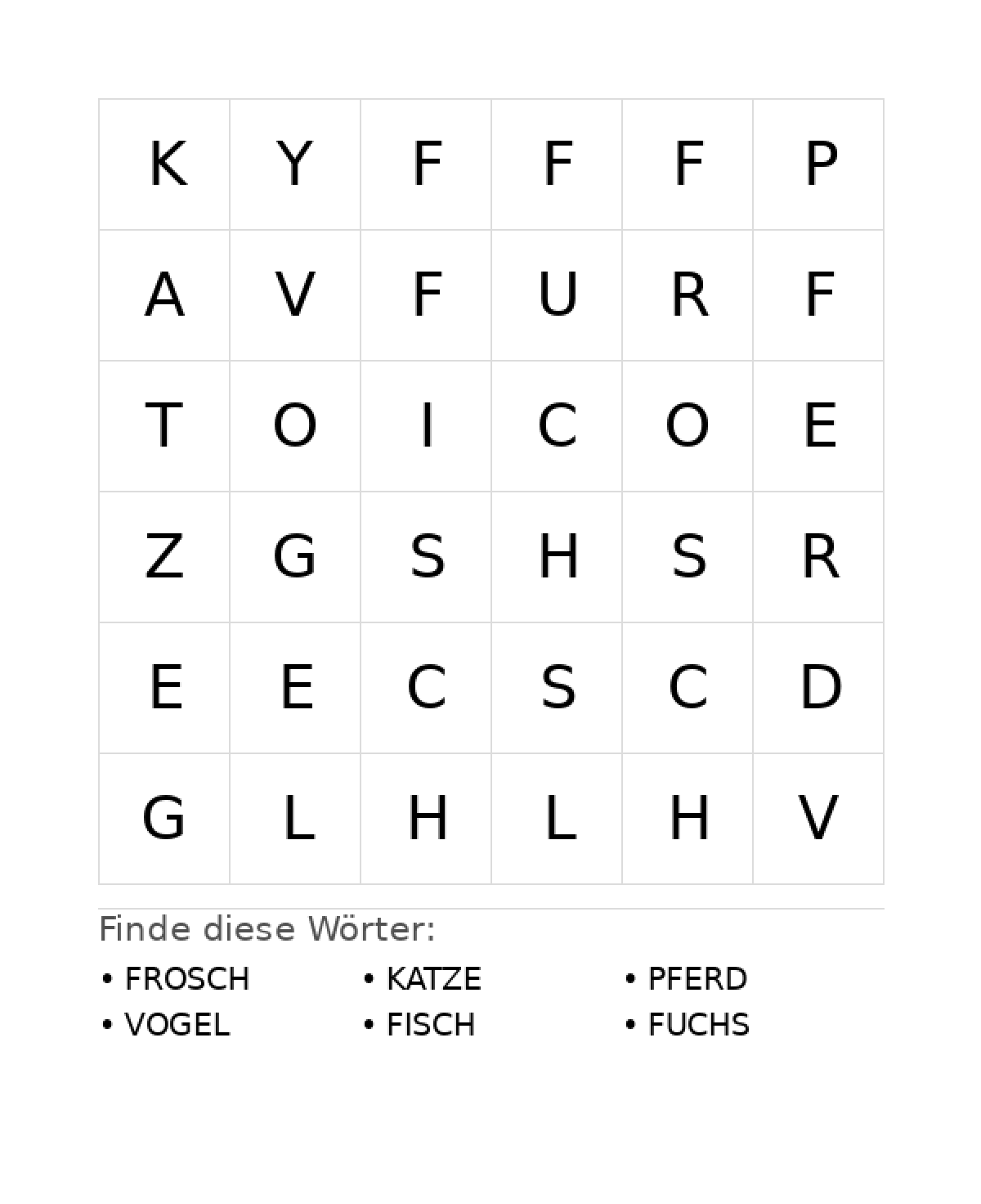 Wortsuchrätsel: Tiere für Vorschule