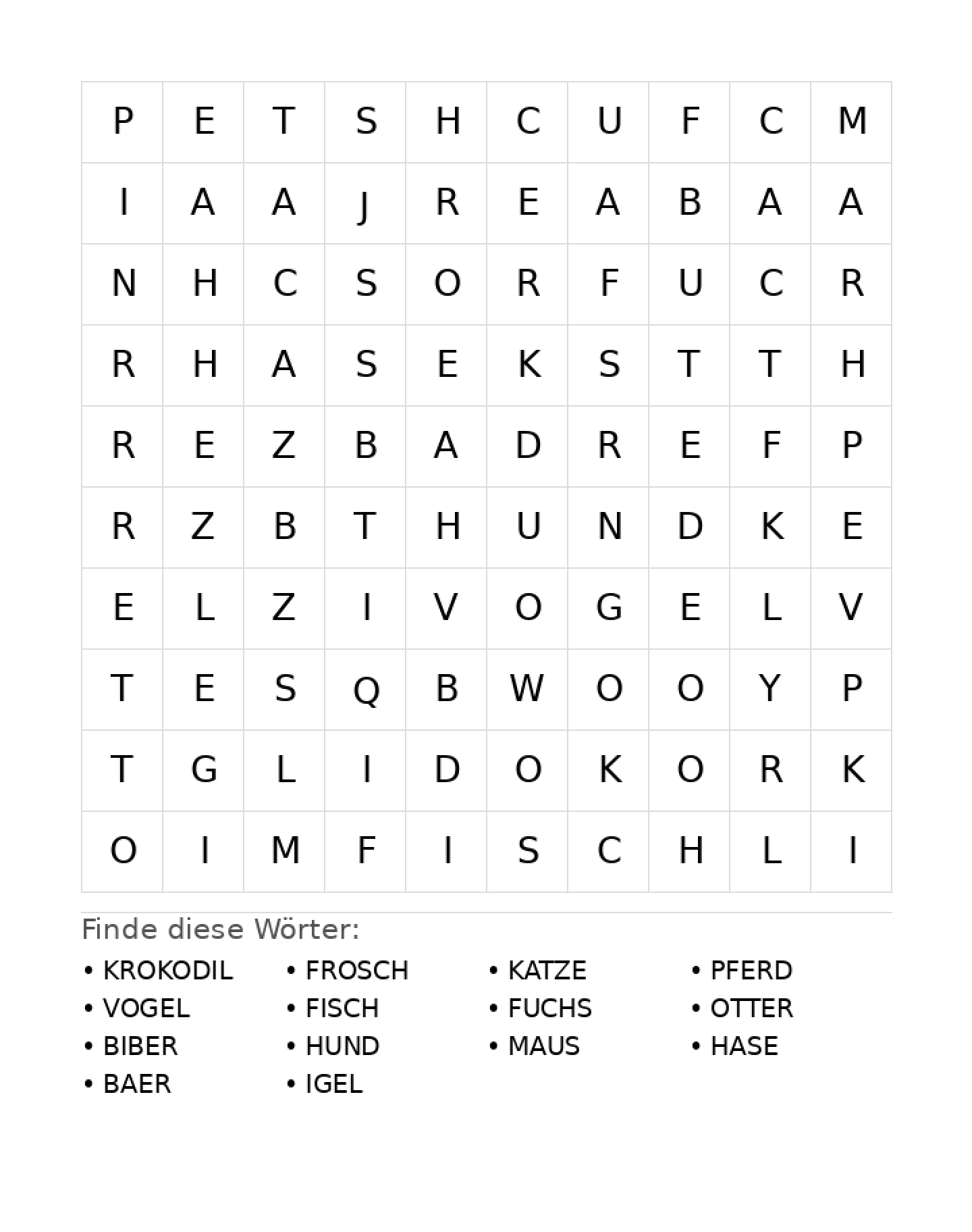Wortsuchrätsel: Tiere für Grundschule